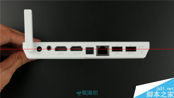 背面接口异常丰富,从左到右是电源、AV、HDMI IN、HDMI OUT、S/P DIF光纤音频输出接口、RJ45网线接口、分别为0.5A和1A输出的双USB接口、独立的电源开关,接口堆料较猛。
