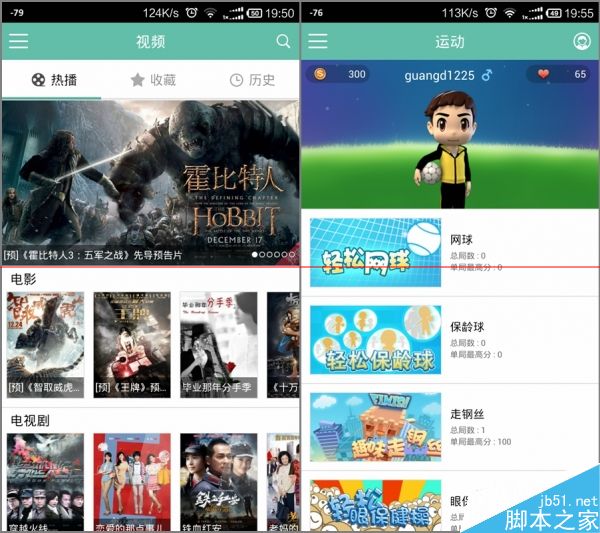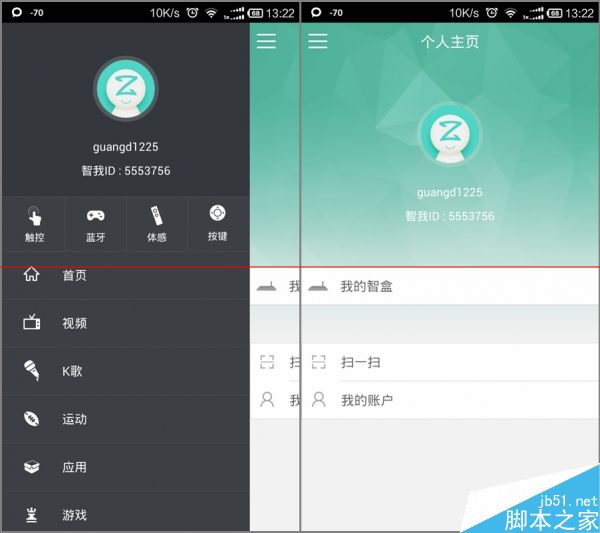 只要手机和电视盒连在同一个路由上,app可以自动识别,另外也支持扫二维码连接。手机客户端为侧栏式设计,TV端的“视频、K歌、运动、应用、游戏”5大功能都在里面。