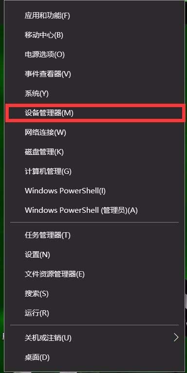 1、在WIN徽标(开始按钮)上右击鼠标,打开“设备管理器”。