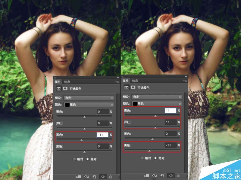 如果我们是在黄色通道中同样减少-11单位色彩,这时就能加蓝: