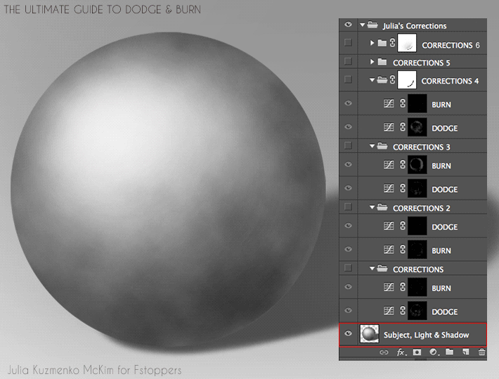 我要介绍用六次“减淡”、“加深”操作把这个凹凸不平的表面逐渐变得均匀、平滑的过程。在一开始的几步操作中,我主要是关注一些小的不平整的局部区域(局部“减淡”与“加深”),然后我再从全局的角度加强光影效果,使得全局的球状效果更加完美。