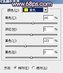 5、创建可选颜色调整图层,对黄,白进行调整,参数设置如图10,11,效果如图12。这一步是给图片加上一些补色。