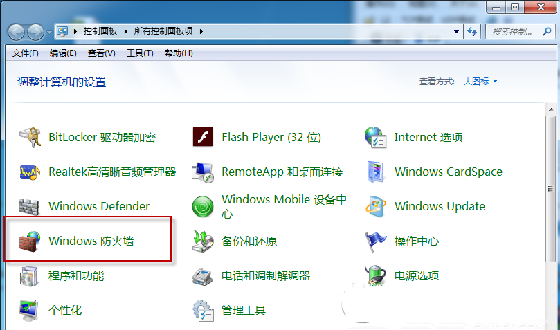 首先选择开始菜单进到控制面板,然后选择windows防火墙