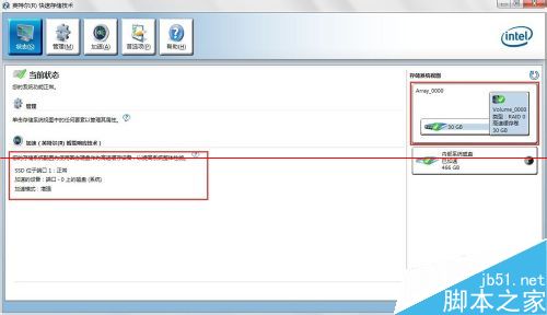 打开“英特尔快速存储技术”,在“状态”选项卡中查看,下图是已经设置SSD加速的状态