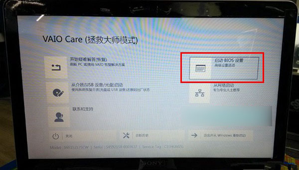 大家可以去查看这篇索尼笔记本预装win8改win7系统详细教程来了解assist键的一大作用,我们不难发现按下assist键便可笔记本就会显示出VAIO Care(拯救大师模式)界面,在该界面可以启动BIOS,或者从介质(USB设备/光盘)启动等等。