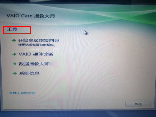 如果点击工具的话,可以进入到高级恢复工具,这样我们自定义恢复C盘,就没有必要删除全部数据。如下图所示: