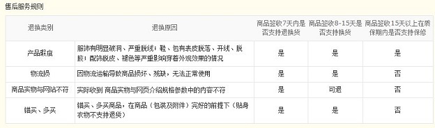 点击上图中的申请后,即可进入具体的申请资料填写界面了,这里会告知你,哪些产品适合退换操作,主要有时间、产品质量问题等方面的限制,具体产品是否符合退换货标准,请参考以下说明: