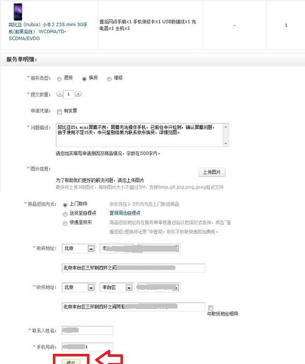 四、如果您符合以上退换服务规格,那么在下方填写退换货原因,填写退换地址等即可,填写完成后,点击底部的“提交”即可,如下图所示: