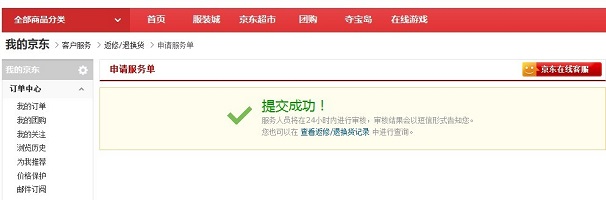 提交后,即可看到相关提交成功的提示了,京东服务人员会在24小时内,完成审核,并且会通过短信形式告知您,另外您也可以在京东商城个人订单中,查看相关处理器进度,如下图所示: