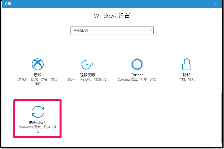 2、在Windows设置窗口中,点击:更新和安全;