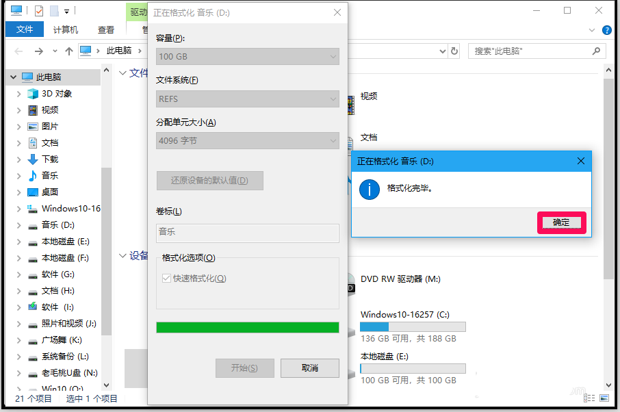 11、右键点击音乐D: - 格式化,选择ReFS文件系统,点击:开始 - 确定,格式化完毕 - 确定;