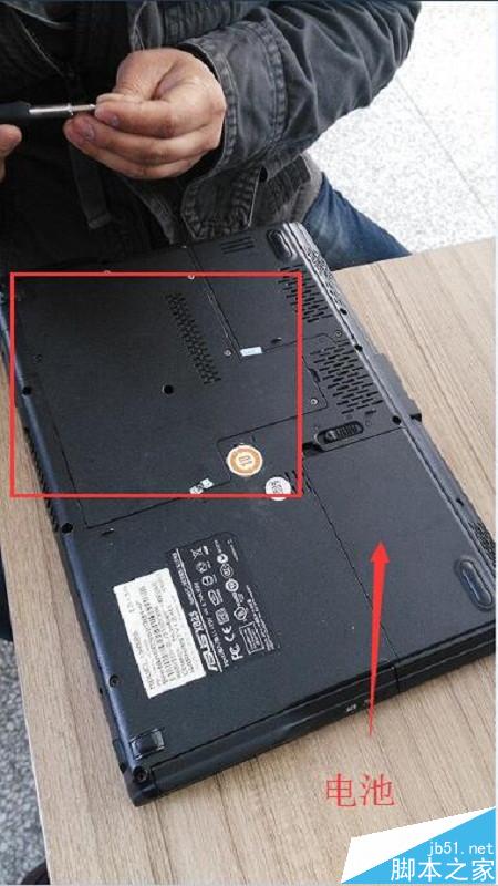 1、首先把笔记本翻过来,图中红框中的盖板即是电脑主板位置,拧开相应的螺丝钉即可看到风扇、内存等。拆机前要拔出电源,并拆下电池。