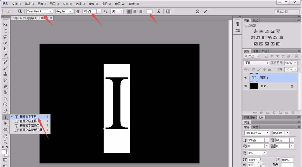 3、点击左侧“横排文本工具”,输入需要处理的文字,并设置文字的颜色、字体和大小。