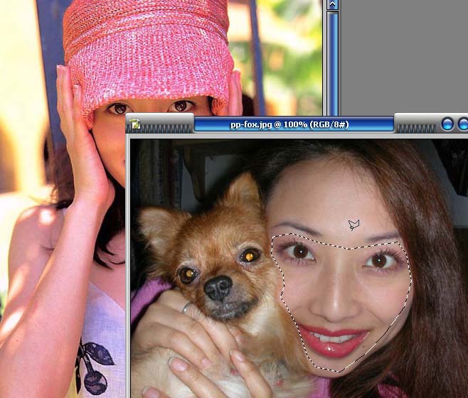 2.按V键切换到移动工具,把选区内的脸部直接托拽到土图1上面,形成一个新图层,命名为pp fox。