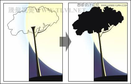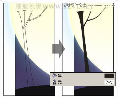 (10)使用“贝塞尔”工具在树干的上部绘制树冠的轮廓图形,将其填充为黑色,轮廓色为无,如图2-57所示。