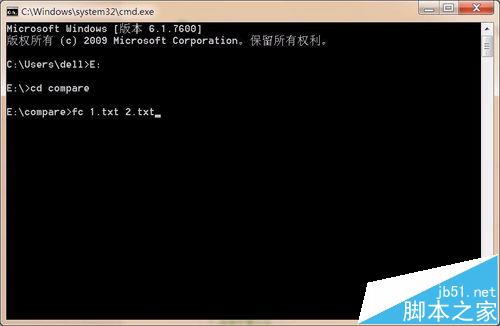 6、使用fc命令来比较两个文件,输入命令“fc 1.txt 2.txt”并回车,对两个文件进行比较。
