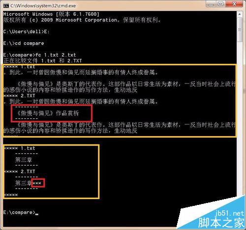 7、观察输入命令后显示出来的比较结果,可以发现计算机很清楚地为我们展示出了两个txt文件中的两处不同,并给出了不同之处的上下文,十分简洁明了。