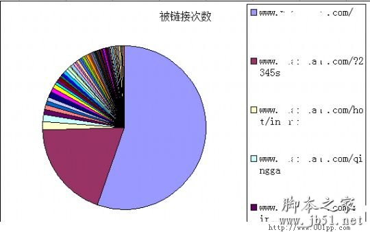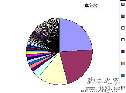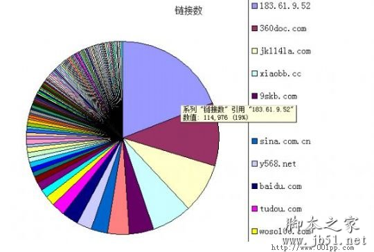 某电影网站,注册仅3年,两百万流量,下文简称电影站,在百度站长平台查询链接后用导出功能下载到本地,排序后生成excel的饼图,(如图一)我们可以清晰地看到,该站即便链接数最多的的来源,所占链接比例也没有超过20%,其链接数量分布非常均匀。