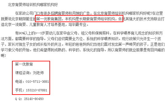 我来也分析下第四个案例,除了财经频道发培训学校的软文外,另一方面这是一篇刻意叠加「名称」的文章。通读文章,作者刻意植入大量学校全称和网址,导致文章读起来很绕口,如果你通读全文的话,会发现本文没有任何价值,完全是为了推广而写的。