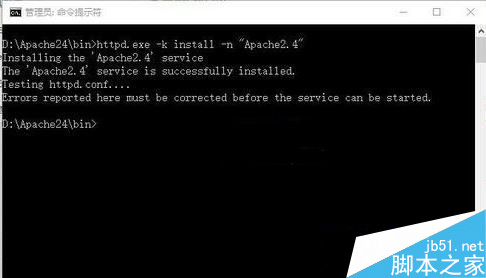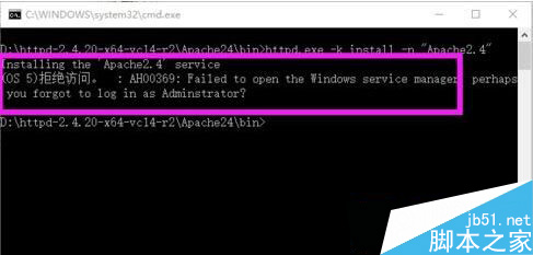 2、然后在执行上面第三步,定位到path:/bin,运行httpd.exe -k install -n “Apache2.4”即可。