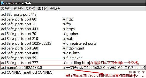 4)关闭DOS窗口,回到桌面。进入我的电脑-C盘,双击打开squid文件夹,双击打开squid.conf文件,对这个文件进行配置编辑。按Ctrl+F,输入acl Safe_ports port 777,回车。然后在# multiling http后面按回车,增加一个空格,写入内容如下图所示。