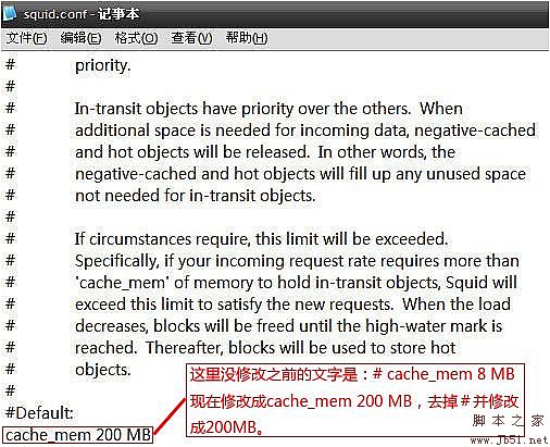 6)找到# cache_mem 8 MB这句删掉前面的#号将默认的8修改到需要的大小,这里的数值应视具体的机器可用内存而定,应在内存允许的情况下尽量地设置的大一些以提高代理服务器性能,但不能让代理服务器的缓存大小影响本机器的性能。如下图操作即可。