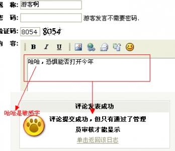 “敏感字”概念正为这个而来,在这个补丁中,将会检查用户发表的评论,除了管理员外,任何人的评论内容里含有“敏感字”,该评论都将被自动设置为未审核状态。之后管理员可以检查该评论再决定是通过还是直接删除。既阻挡了非法言论的出现又避免了用户的正常评论被无辜拦截。见图: