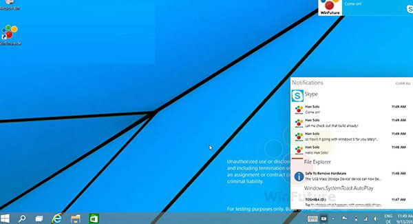 正如大家所想的,Windows9所有的系统和应用通知都可以显示在这里,你不会错过通知,当然也可以选择全部清除。和WP8.1通知中心相比,没有集成控制中心,在右下角固定区域显示。