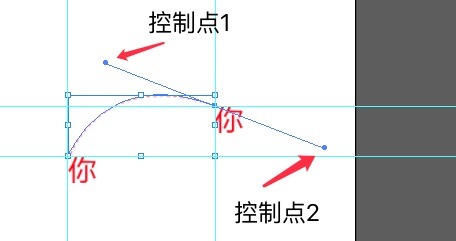然后选择钢笔工具, 先后在起点和终点处点击, 在点击终点后鼠标不要松开, 直接拖动AI会自动添加2个控制点. 通过移动鼠标可以调整两个控制点的位置, 从而达到调整钢笔工具所生成的路径的目的, 直到和设计稿上的参考线路径一致.如下所示: