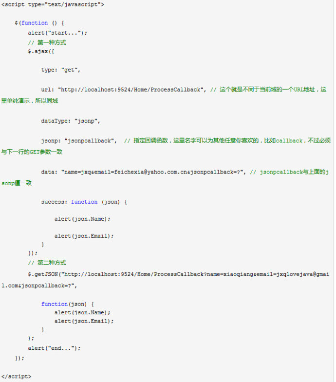 这样返回给前端的就是类似这种jQuery17104721....('{Name:"jxq", Email:"feichexia@yahoo.com.cn"}'),它一返回到前端就会执行,得到的是一个JavaScript对象,对象有两个属 性:Name和Email,所以我们可以直接调用json.Name和json.Email
