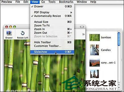 若您打算以幻灯片秀方式显示一大堆图片,请将多张图片拖到 Dock 中的“预览程式”图像里,则“预览程式”的主要视窗会显示第一张图片,而其它会以缩览图方式显示于抽屉中。然后从“显示方式”选单中,选择“幻灯片秀”即开始播放幻灯片秀。