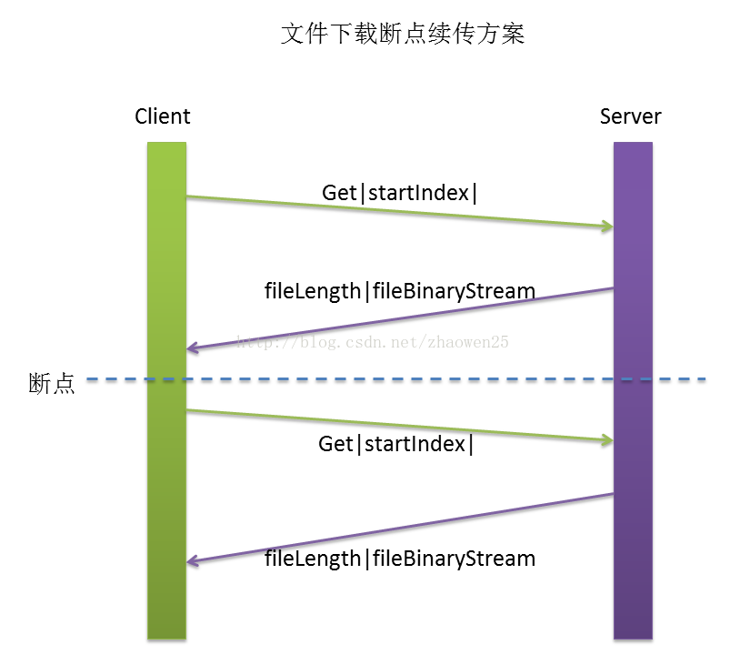 在网络状况不好的情况下,对于文件的传输,我们希望能够支持可以每次传部分数据。断点续传其实正如字面意思,就是在下载的断开点继续开始传输,不用再从头开始。所以理解断点续传的核心后,发现其实和很简单,关键就在于对传输中断点的把握,我就自己的理解画了一个简单的示意图: