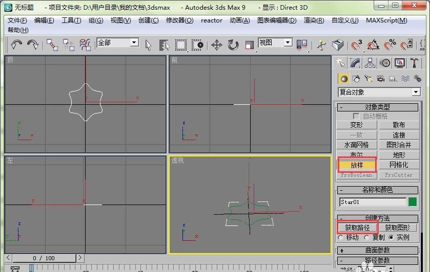 5、单击复合对象,点击下方的“放样”按钮,在卷展栏中点击获取路径。