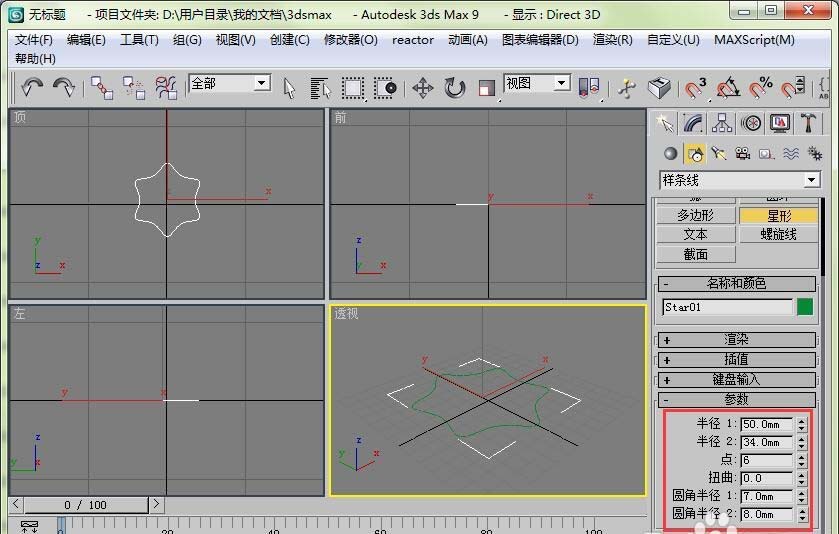 1、在创建面板中单击图形按钮,然后类型选择样条线,选择星形。