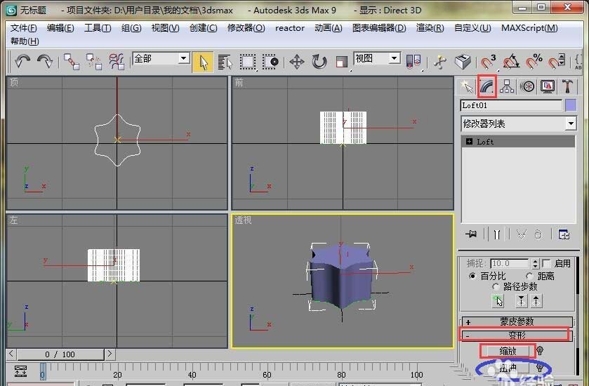 7、进入修改面板,在变形的卷展栏中有缩放按钮。