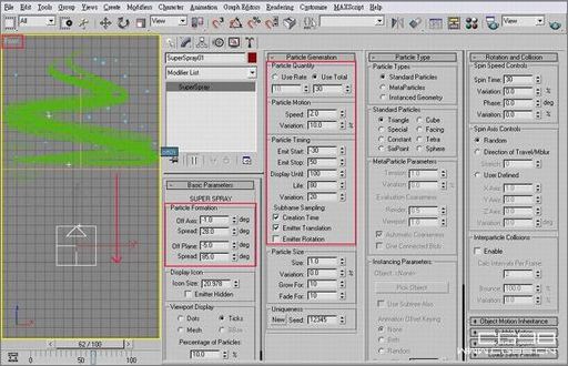 1.到上视图,在螺旋体中央处建立一个 Super Spray 分子系统。