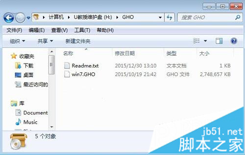 2、把win7.gho文件解压到到U教授维护盘的GHO目录中;