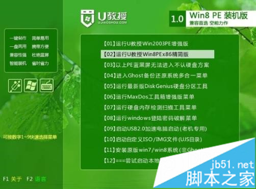 4、启动进入U教授主界面,按数字【02】运行U教授Win8PEX86精简版;