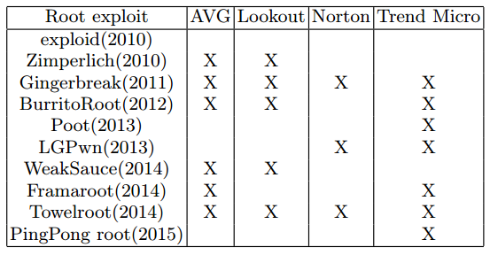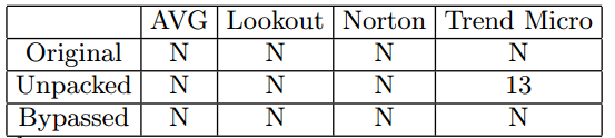 研究者将相同的167个漏洞利用捆绑放进一个自主研发的应用程序当中,检测安卓杀毒程序(AV)是否能够检测到。每个利用以三种不同方式暴露于杀毒程序面前——从root供应商网站下载的原始exp,一个直接暴露于AV引擎的脱壳exp,以及恶意软件经常使用的加壳exp。检测结果显示,四款AV产品只有来自趋势科技的一个程序检测到了exp,其测试结果为167中的13个exp,并且都是脱壳当中。