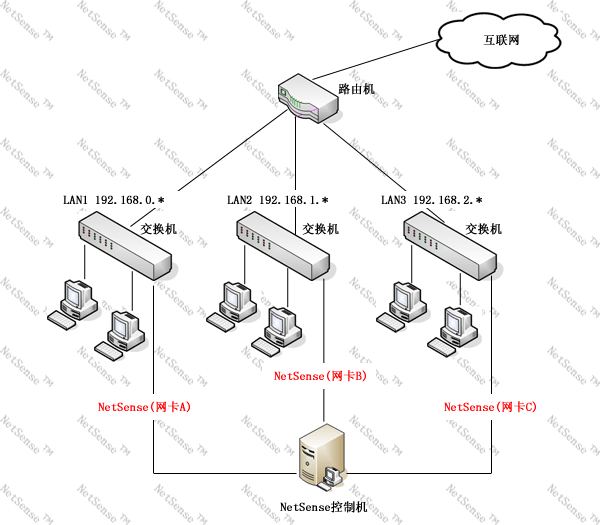 此种跨网段上网监控方式,适合网段数量较少(2-5个),或者物理上网分散但又不是距离太远的网络结构(否则需要另行部署一台电脑,并单独再安装聚生网管软件),通过安装多块网卡可以集中监控多个网段电脑上网行为,便于实现统一的局域网网络管理和上网行为控制。如下图所示: