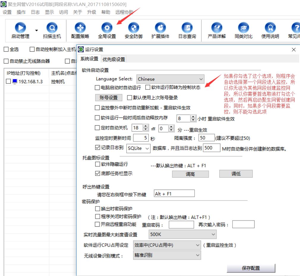 如果你勾选了“软件运行自动转入控制”,则你可能无法创建其他网卡的监控网段,因为程序会自动选择第一个网段进入监控界面。因此,需要在“全局设置”这里取消,如下图所示: