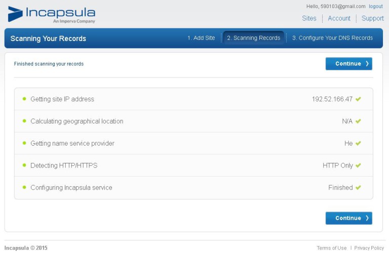 Incapsula有美国、英国、以色列、日本和新加坡等多个节点,Incapsula使用非常简单,首先,注册账户,然后,验证邮箱,再接着,添加域名,下一步之后,会得到系统分配给你的cname域名和ip地址。诸如: