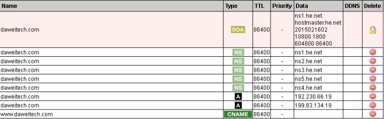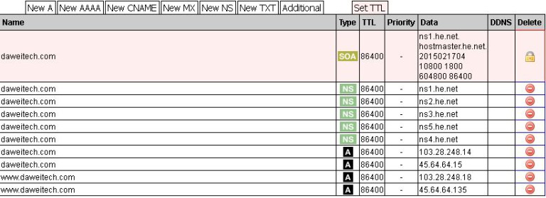 个人还是比较喜欢使用he.net提供的DNS服务的,如果你自己有DNS,也可以用自己的方式去设定