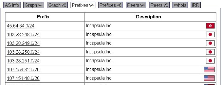 我们看一下Incapsula的IP范围,Incapsula自己公司的IP大多在美国和以色列,日本有4组,香港1组,我们要的就是日本香港这5组其中的IP。