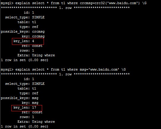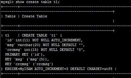 CREATE TABLE `t1` ( `id` int(11) NOT NULL AUTO_INCREMENT, `msg` varchar(20) NOT NULL DEFAULT '', `crcmsg` int(15) NOT NULL DEFAULT '0', PRIMARY KEY (`id`) ) ENGINE=MyISAM AUTO_INCREMENT=3 DEFAULT CHARSET=utf8