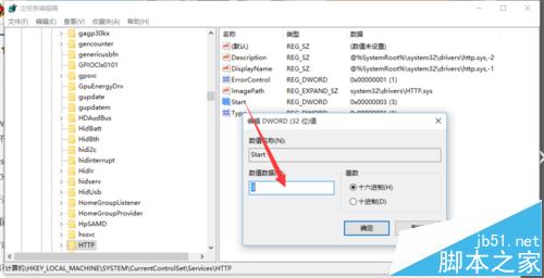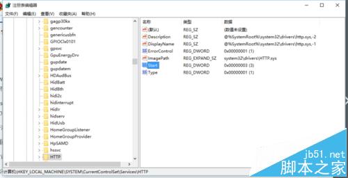 3、打开注册表:regedit。找到:HKEY_LOCAL_MACHINE\SYSTEM\CurrentControlSet\services\HTTP