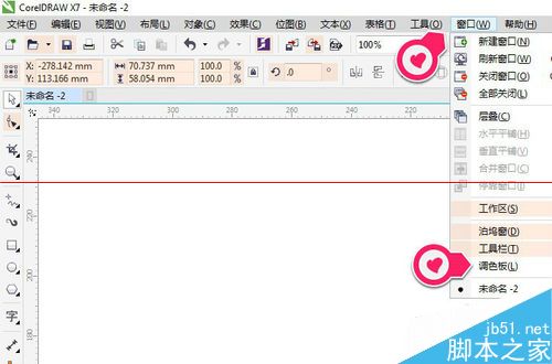 3、打软件或文档,在菜单栏里找到窗口——点击调色版,如图
