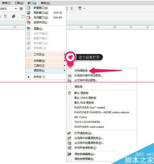 4、打开调色版——找到文档调色版,发现这个没有打开。一般打开会显示打钩,如果是X7版的会显示方框。这时没有显示,即是关闭的。如图