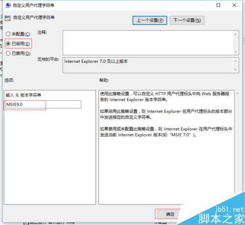 在打开的窗口中选择“已启用”,然后在下方输入IE版本字符串的方框中输入“MSIE9.0”点击确定,退出策略组,重启浏览器则乱码会变成中文了