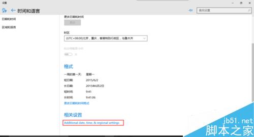 第二步,点击屏幕左下角的开始菜单----选择“设置(setting)”----时间和语言----点击相关设置下的“Additional date,time,& regional settings”